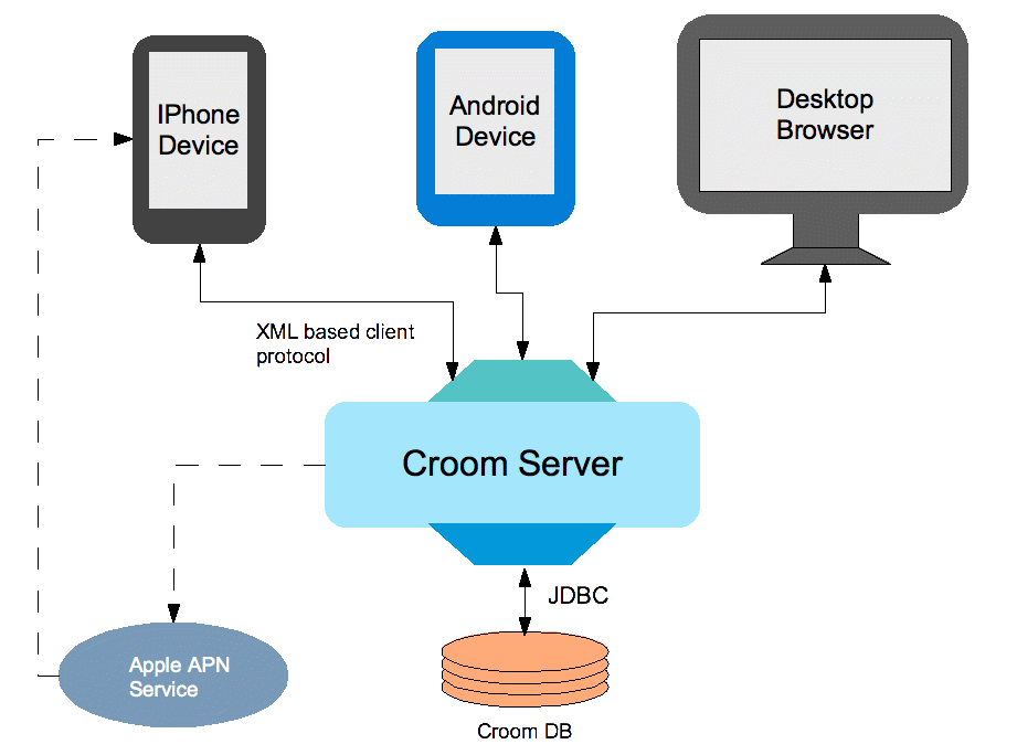 Designed as a 3-tier client server application, a mobile or web device connects to an appropriate croom server for message delivery and message retrievel. All needed information is stored in a database to which the croom server is connected to.