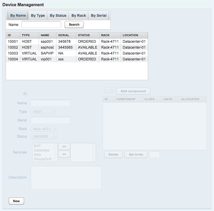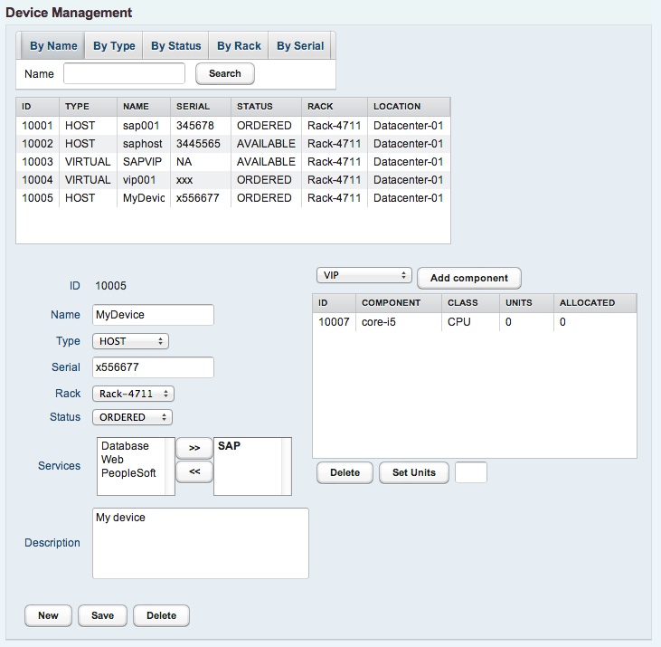 Systems are build up based on any device components. In terms of configuration and asset management, an inventory of all existing and ordering devices is pretty useful. This is the base of consistent system and service management. The SysMT device management section provides powerful data structures to store this information. This includes datacenter locations, server racks, any kind of server and storage devices but also cabeling components.