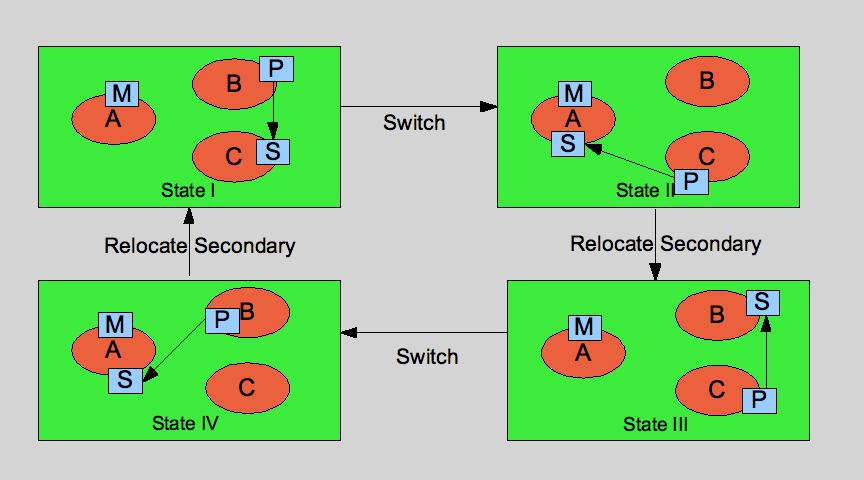 Another switch changes to role of primary and secondary again to system state IV. With a relocation and initial copy the original system state can be reached.